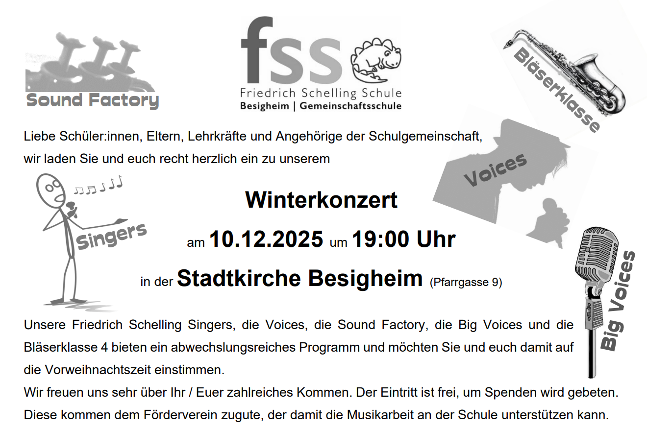 Liebe Schüler*innen, Eltern, Lehrkräfte und Angehörige der Schulgemeinschaft, wir laden Sie und euch recht herzlich ein zu unserem Winterkonzert am 10.12.2025 um 19:00 Uhr in der Stadtkirche Besigheim (Pfarrgasse 9) Unsere Friedrich Schelling Singers, die Voices, die Sound Factory, die Big Voices und die Bläserklasse 4 bieten ein abwechslungsreiches Programm und möchten Sie und euch damit auf die Vorweihnachtszeit einstimmen. Wir freuen uns sehr über Ihr / Euer zahlreiches Kommen. Der Eintritt ist frei, um Spenden wird gebeten. Diese kommen dem Förderverein zugute, der damit die Musikarbeit an der Schule unterstützen kann.